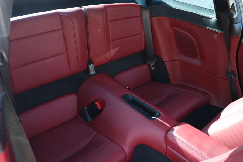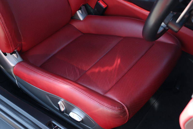 ツートンレザー(ブラック × レッド)とカラーインストルメントパネル(レッド)が揃うこの仕様は、オーダー時のこだわりが随所に感じられます。シートの状態は良好で、ステアリングやシフト周りも使用感は少なく、走行距離以上にコンディションが良い印象です。アルカンターラルーフライニングの毛並みも綺麗に保たれています。